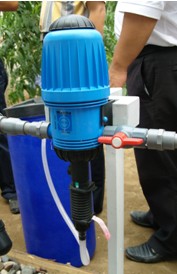 比例注肥器直接安装在工艺水管线上(串联或并联),利用管路中水流的压力驱动,比例泵体内活塞做往复运动,将充分混合后的药剂输送到下游管路中,且无论管路中水压及水量如何变化,吸入的药剂始终同进入比例加药泵水的体积成比例,确保混合液的比例恒定。